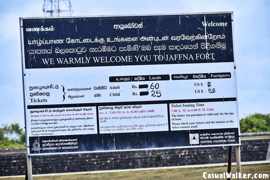 Open Timings: Jaffna Fort is open to visitors every day of the year from 8:00 AM to 6:00 PM. The entry fee is straightforward and reasonable — foreign adults pay USD 5, foreign children aged 6 to 12 pay USD 2.50, and children under 6 enter free. SAARC nationals receive a 50% discount on the foreign adult rate. Local Sri Lankan adults pay LKR 60 and local children LKR 25. Tickets are purchased at the entrance gate, and a small shop nearby sells books, posters, and branded souvenirs worth browsing on your way in or out.
