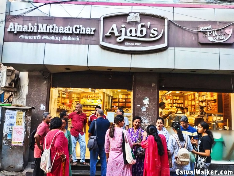 Elephant Gate Street (Left off Mint Street): This is where you find Shree Vada Pav, Chotu Motu Sweets and Savouries, and the iconic Ajab’s (Ajnabi) Mithai Ghar. Narrower, livelier, and always smelling gloriously of fresh jalebis.