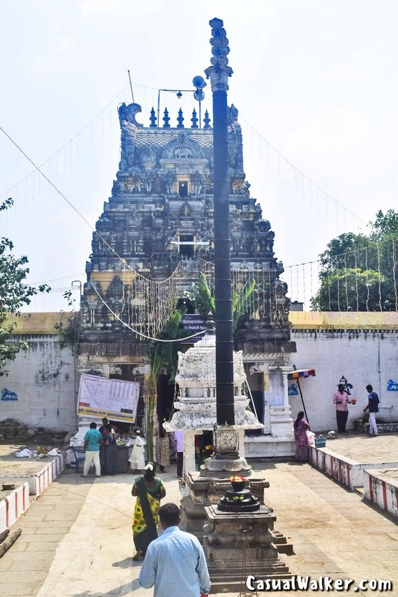 In front of the Rajagopuram stand the traditional elements: the Rishabam (Nandi statue), Balipeedam (offering pedestal), and Dwajasthambam (flag staff), all aligned in perfect symmetry with the sanctum sanctorum.