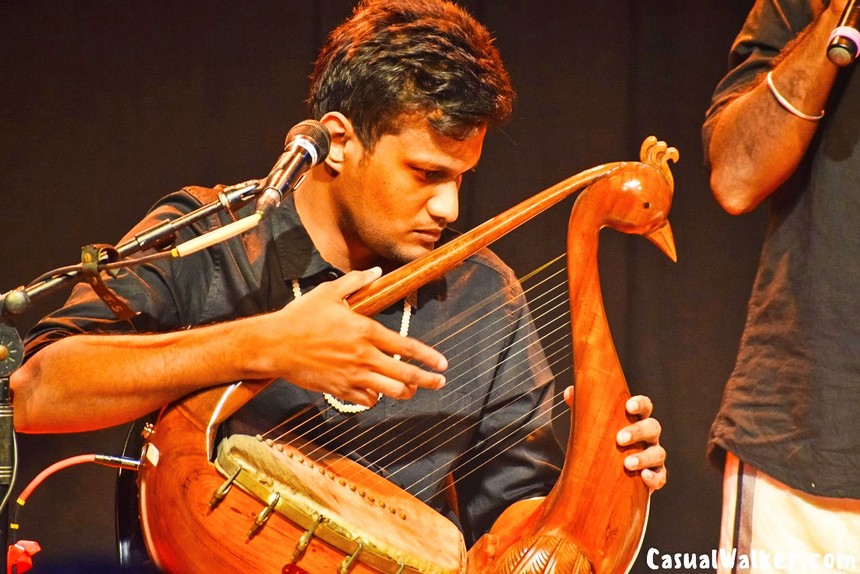 The ensemble that evening was extraordinary. Alongside the reconstructed yazh, talented musicians performed with the kanjira’s rhythmic pulse, the flute’s melodious whispers, the kombu’s powerful calls, the kokkarai’s distinctive tones, the sangu’s sacred resonance, the peppa’s earthy voice, and the parai’s commanding beats. Each traditional South Indian instrument contributed to a soundscape that felt both ancient and alive.